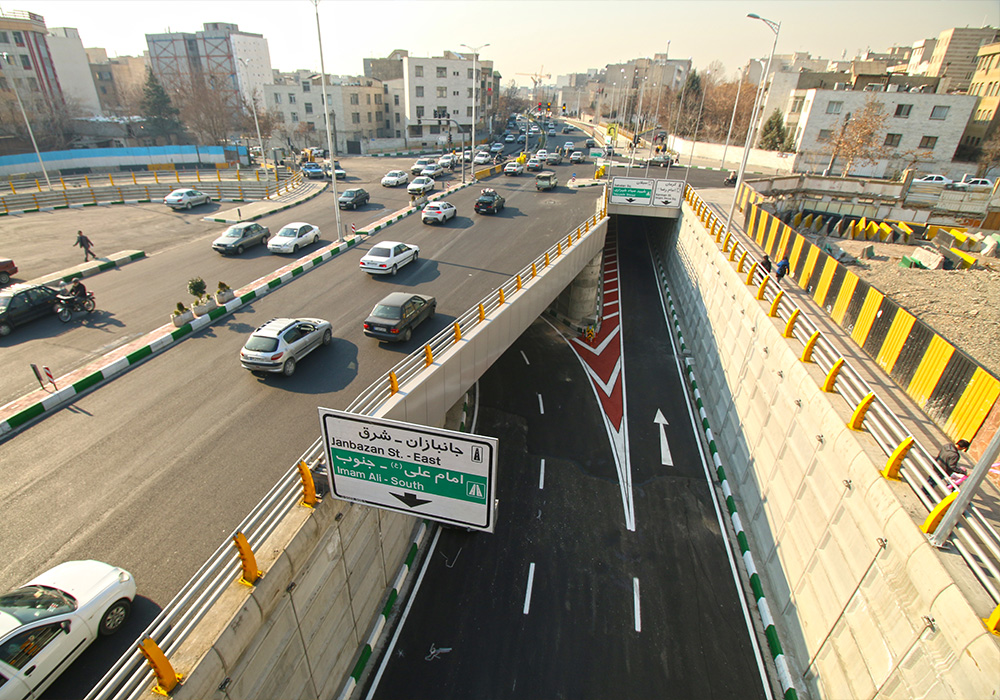 The project includes an east-west underpass along Janbazan Street. The first lane passes under Kerman Street and continues west. The second lane acts like a U-turn exit continuing toward Eastern Janbazan Street and Southern Imam Ali Expressway. Two underpass crossings make it possible for the vehicles to access Western Janbazan and Northern Kerman Streets through the East-West Axis of Janbazan Street. The projects total area is about 21,000 m2.